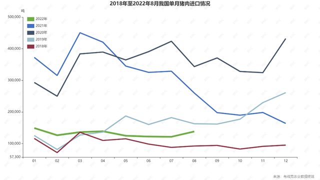 由于前期国内外猪价倒挂,导致进口猪肉锐减。据海关数据,猪肉进口量在2020年前8个月为284万吨,2021年前8个月为281万吨。然而,2022年1~8月,只有106万吨,同比下降超过六成,远低于同期。